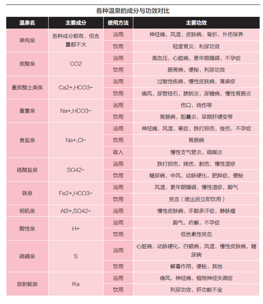 温泉的保健功效主要有三部分:一是依靠地热水的温度;二是温泉流动时产生的机械冲击作用;三是温泉中所含的矿物质成分。日本温泉专家德村志成表示,世界上有11种温泉分类,因此日本有严格规定,每个温泉都应注明成分标示,让游客在泡之前心中有数。在中国,常见的温泉主要有五种,在泡温泉之前,应根据自身情况选择合适的种类。