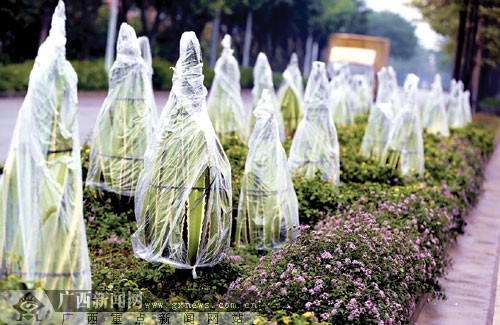 壮锦大道上,绿化工人正在给鸡蛋花树裹上薄膜御寒。记者 农如松摄