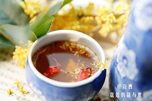 1.将桂花摊开风干一夜,加入白糖,放到酒缸中发酵。