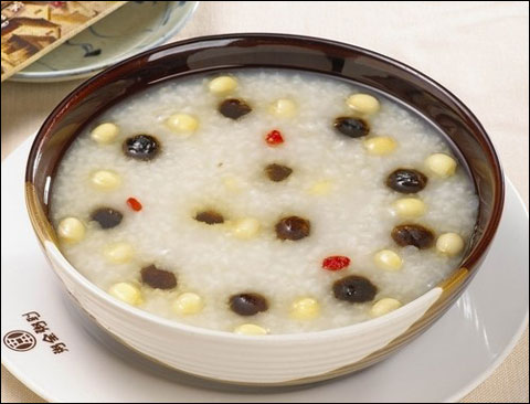 做法:莲子先煮片刻,再放入百合、大枣、银杏、粳米煮沸后,改用小火煮至粥稠时加入冰糖稍炖即成。